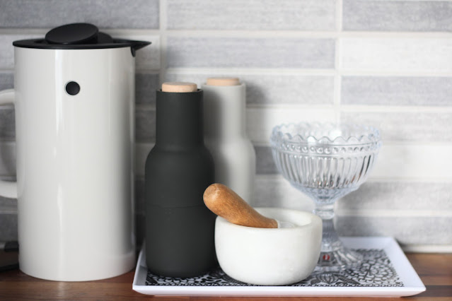 Aloitin tyhjentämällä keittiötasot ja karsimalla turhat tavarat hiiteen. Puoliso oli esimerkiksi hamstrannut tarjottimen päälle oliiviöljyn lisäksi kolme muuta öljypulloa. Kukapa sitä nyt ei tarvitsisi jatkuvasti kurpitsansiemen-, saksanpähkinä- ja tryffeliöljyä? Kaikissa toki päiväys oli jo mennyt vuosia sitten. Pöytätasoille pääsi pienkodinkoneiden lisäksi harvat ja valitut. Tässä asetelmassa vedenkeitin, suola- ja pippurimyllyt, marmorinen mortteli sekä viime syksynä kirpparilta bongattu Mariskooli.